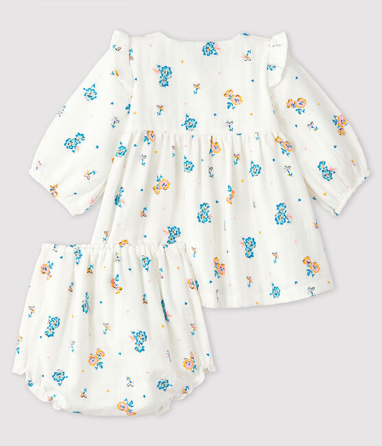 • Abito a fiori a maniche lunghe con bloomer bimba in tessuto pannolino bianco MARSHMALLOW/bianco MULTICO