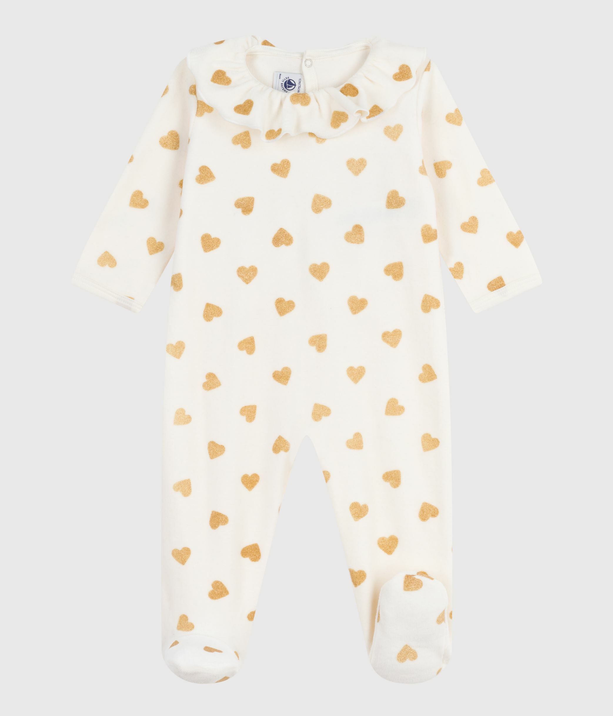 Pigiama per neonato in velluto con apertura sul retro e stampa con cuori di paillettes